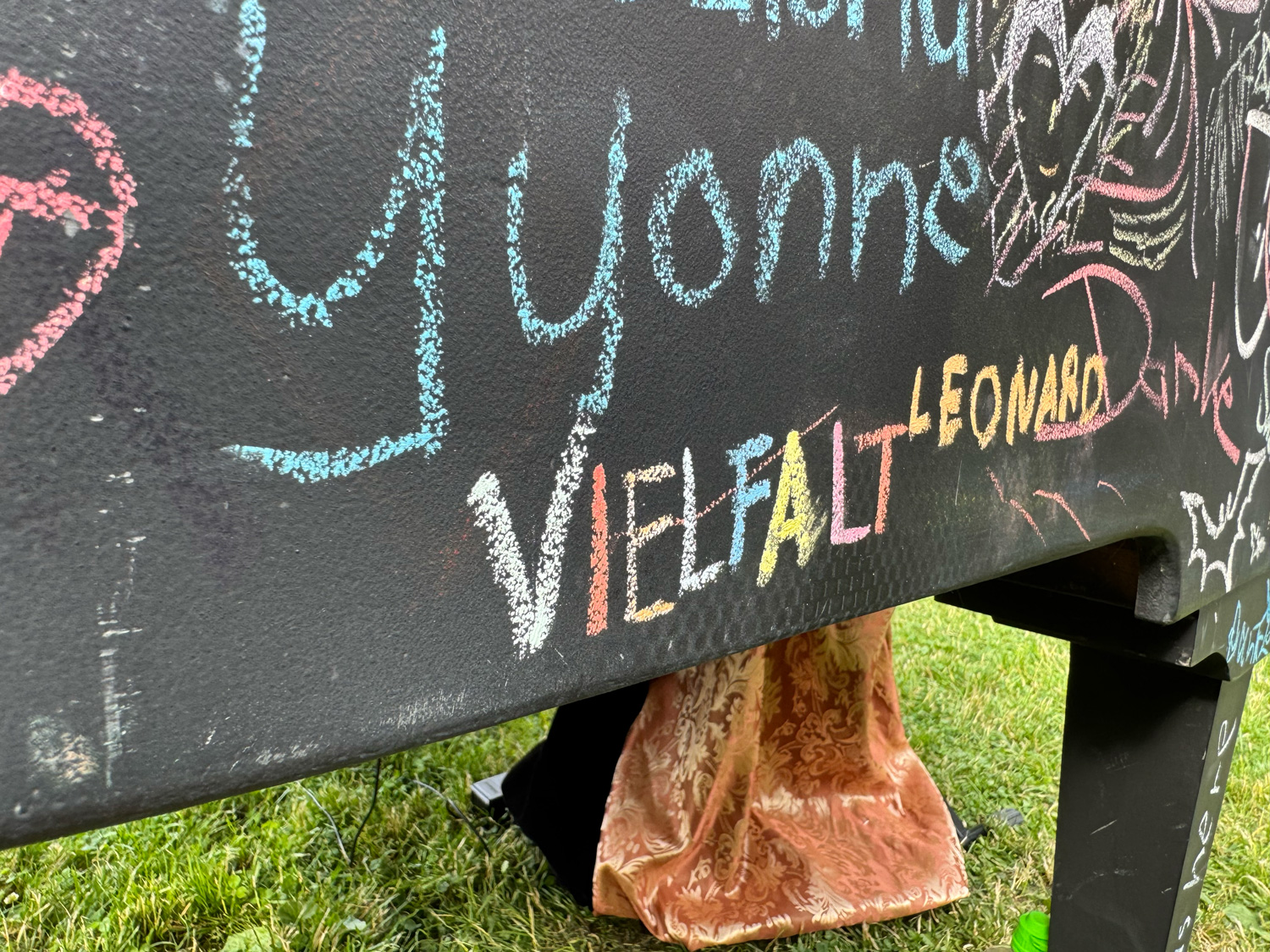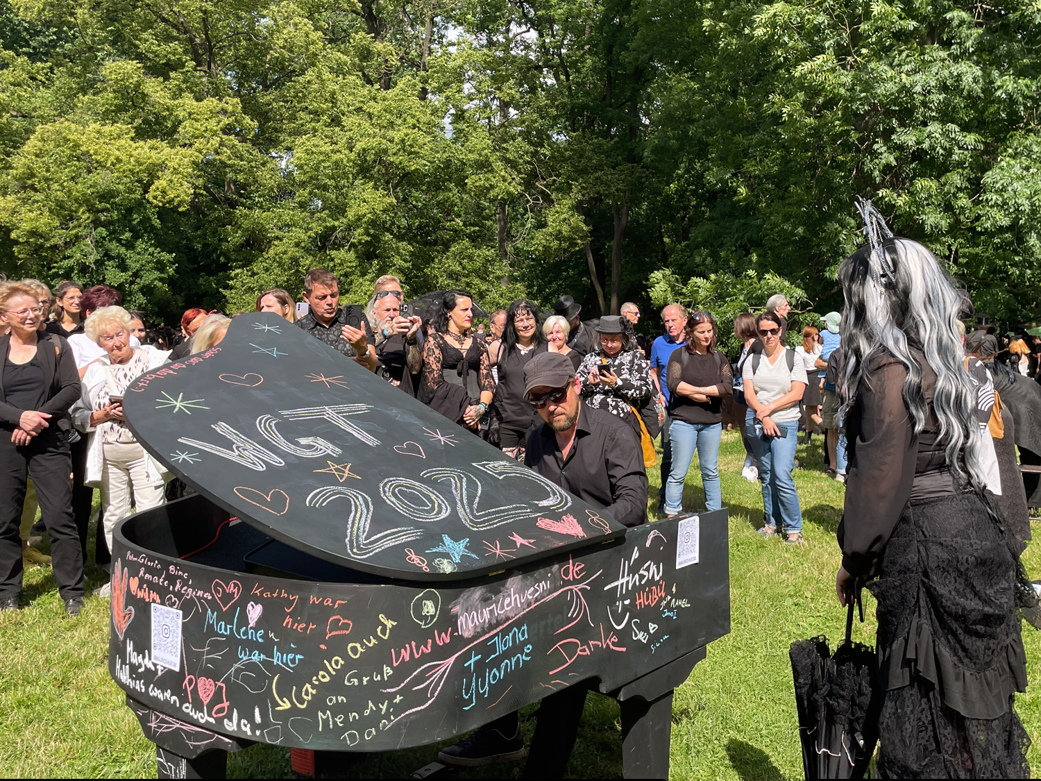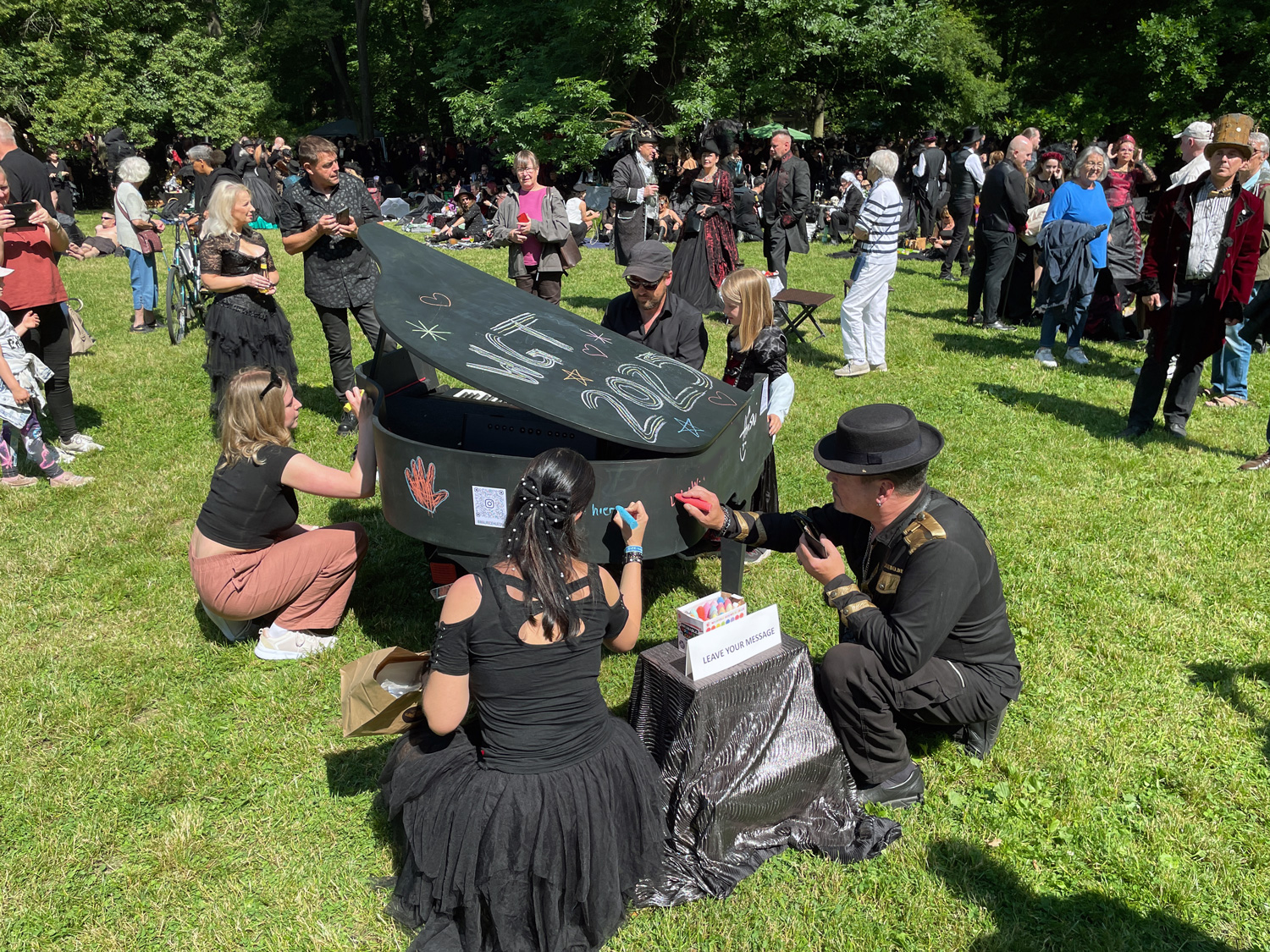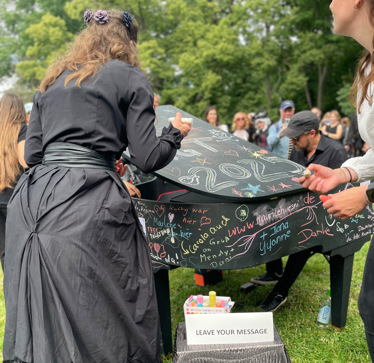 Jedes Jahr strömen tausende Menschen aus aller Welt zum Wave-Gotik-Treffen (WGT) nach Leipzig. Nirgendwo sonst lässt sich die Liebe zur „schwarzen Szene“ so stilvoll zelebrieren, wie beim viktorianischen Picknick. Warum also nicht auch etwas Farbe ins Spiel bringen? Ein großer Flügel, bereit, bemalt zu werden. Daneben eine Kiste bunter Straßenkreiden. Auf einem kleinen Zettel steht geschrieben: Leave your message …