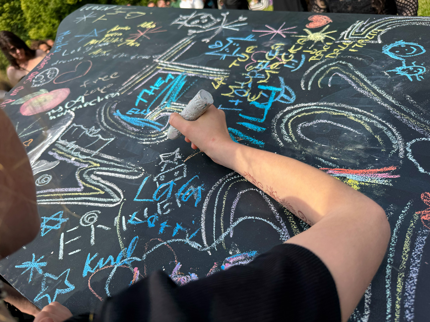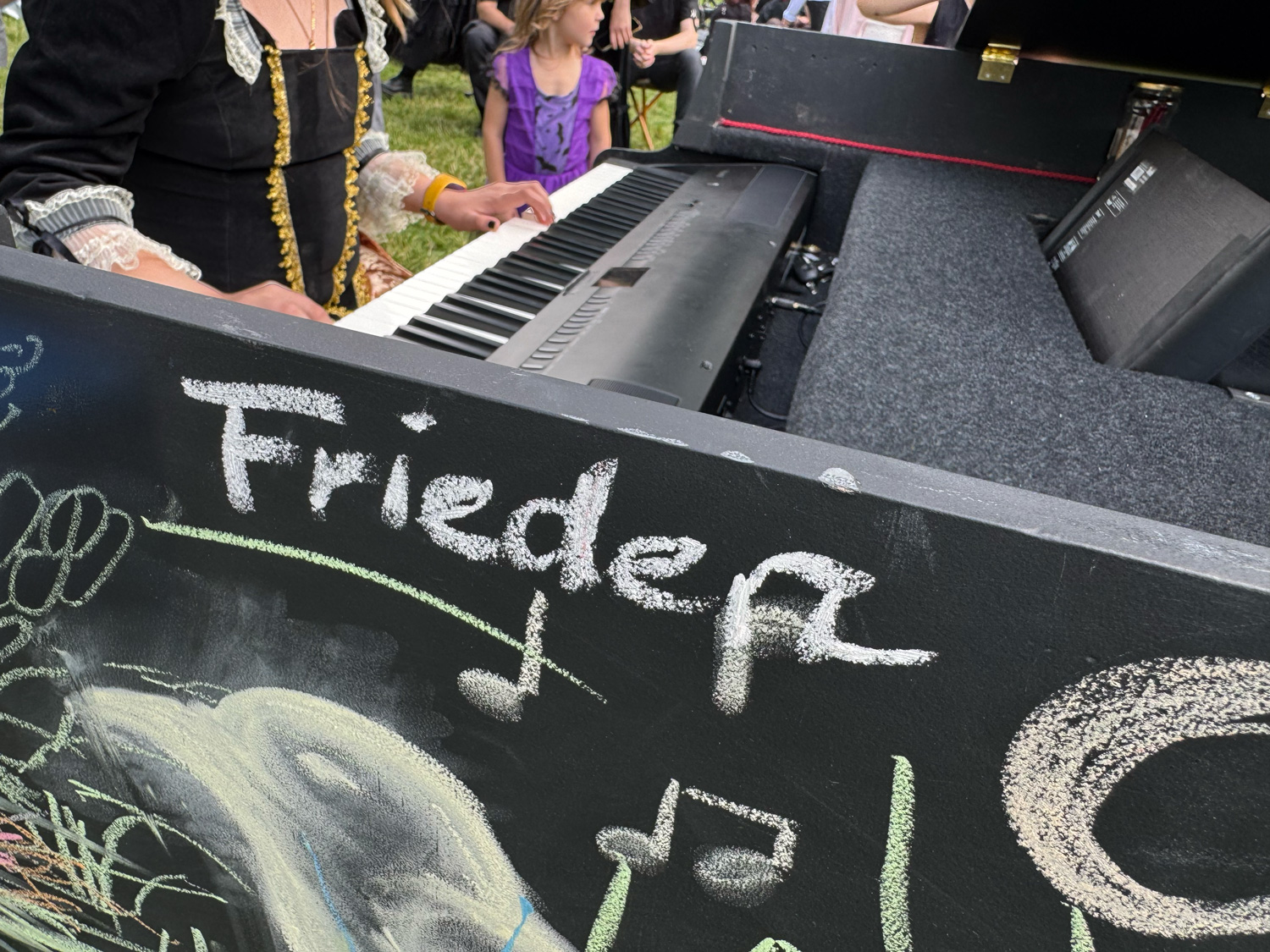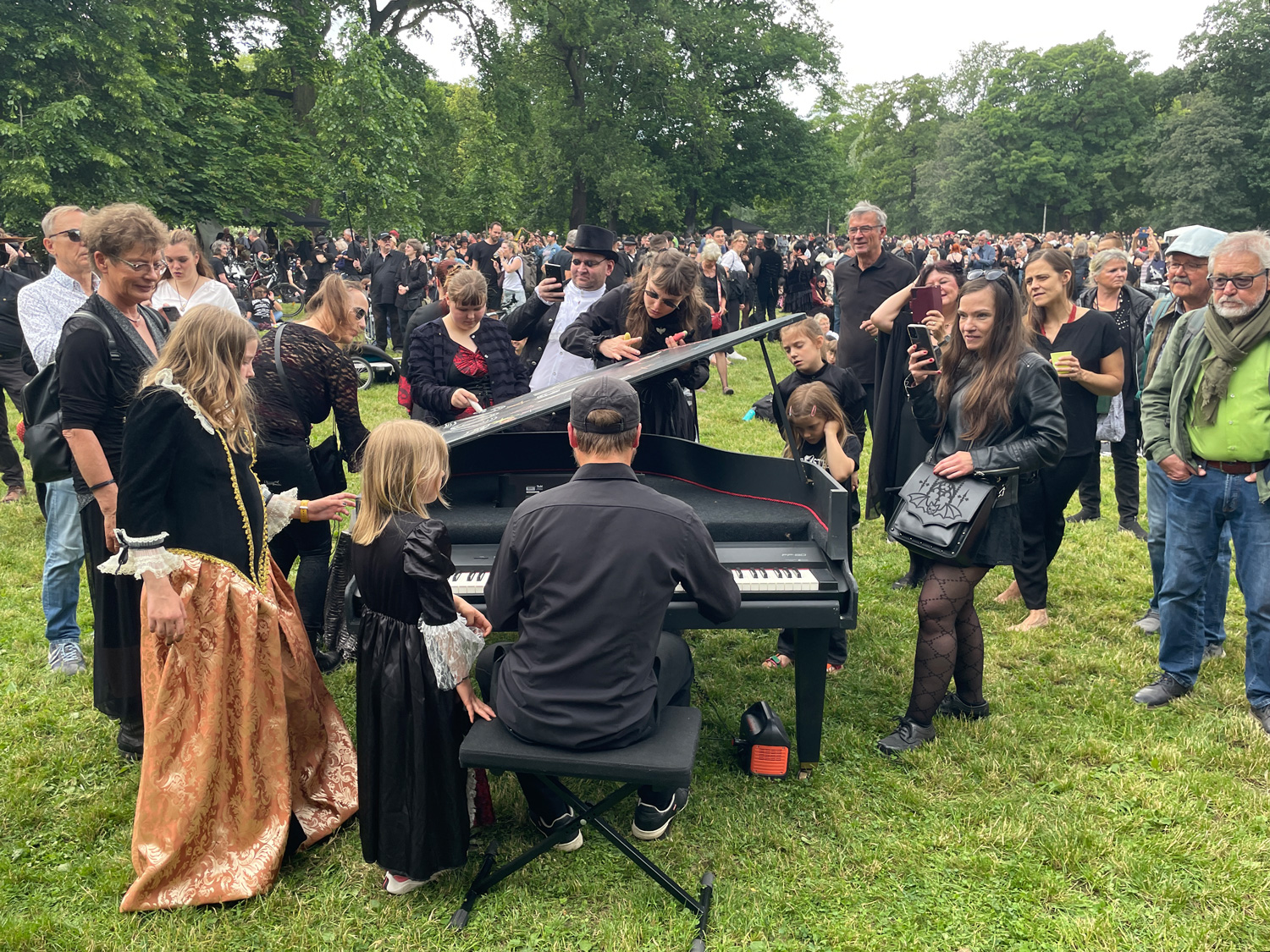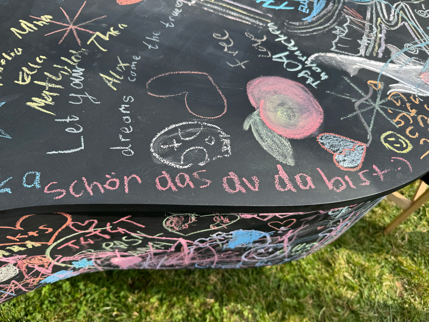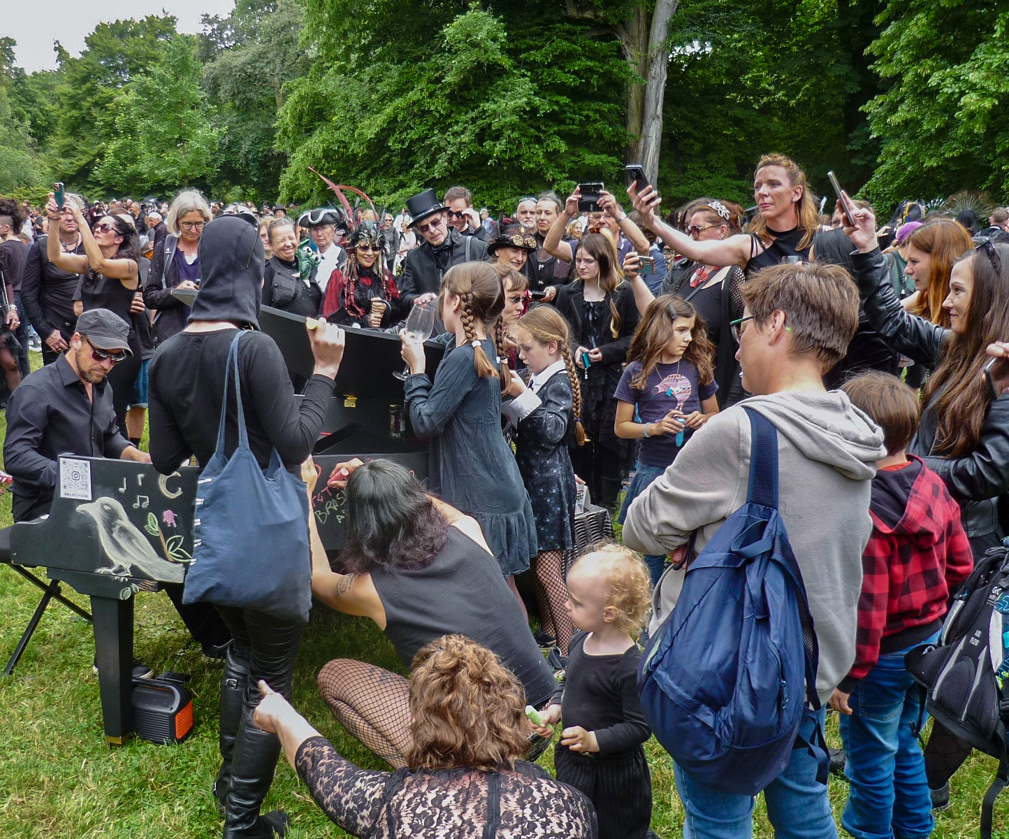 Jedes Jahr strömen tausende Menschen aus aller Welt zum Wave-Gotik-Treffen (WGT) nach Leipzig. Nirgendwo sonst lässt sich die Liebe zur „schwarzen Szene“ so stilvoll zelebrieren, wie beim viktorianischen Picknick. Warum also nicht auch etwas Farbe ins Spiel bringen? Ein großer Flügel, bereit, bemalt zu werden. Daneben eine Kiste bunter Straßenkreiden. Auf einem kleinen Zettel steht geschrieben: Leave your message …